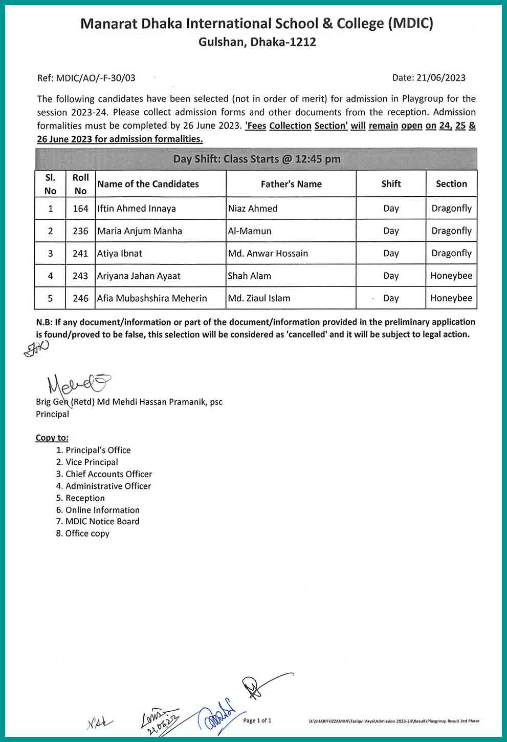 Result for selected students (New Admission) of Playgroup (Day Shift) for the session 2023-24 (3rd Phase):